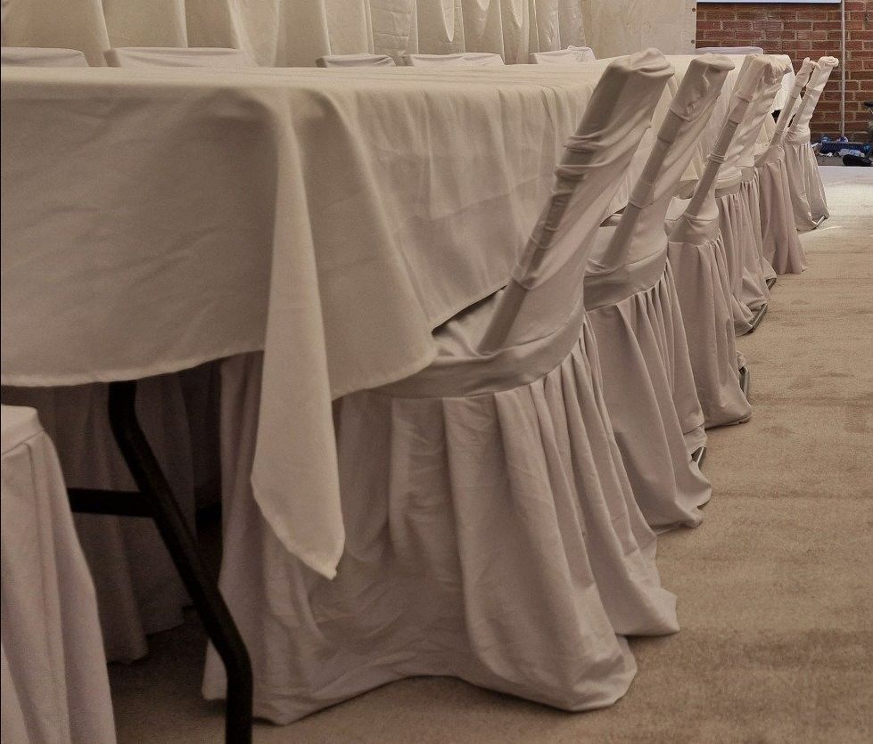 White Skirt Covers fully dress our folding chairs from top till bottom, transforms your folding chairs into a more elegant finish.
